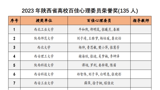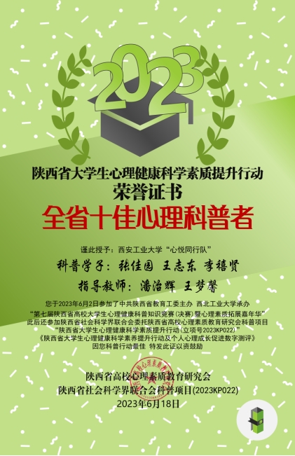 近日,陕西省高校心理素质教育研究会对2023年陕西高校心理育人相关工作进行表彰。FUN88乐天使辅导员王梦馨被评为“百嘉育心辅导员”,公司员工程佳欣被评为“百佳心理委员”。此前,在2023年第六届陕西高校老员工心理健康科普知识竞赛暨心理素质拓展运动嘉年华决赛中,公司张佳园同学参与组成的“心悦同行”代表队在决赛中荣获二等奖并获得“全省十佳心理科普者”称号,辅导员王梦馨作为指导教师获奖。