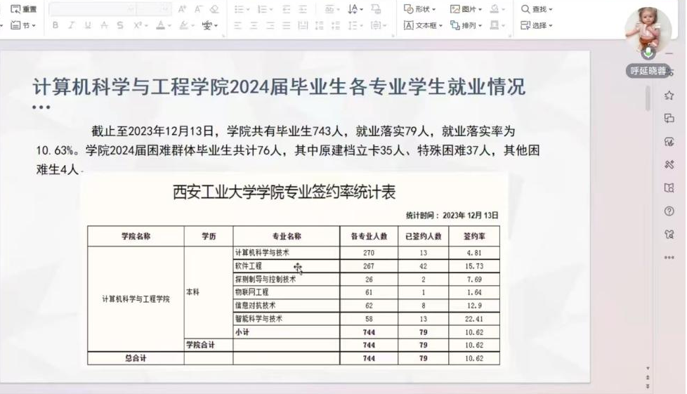呼延老师先是详细分析了2024届毕业生各专业员工就业情况,并分享了公司的就业率数据,以及FUN88乐天使的各专业签约情况,然后介绍了当前需就业员工自身存在的问题和就业现状。