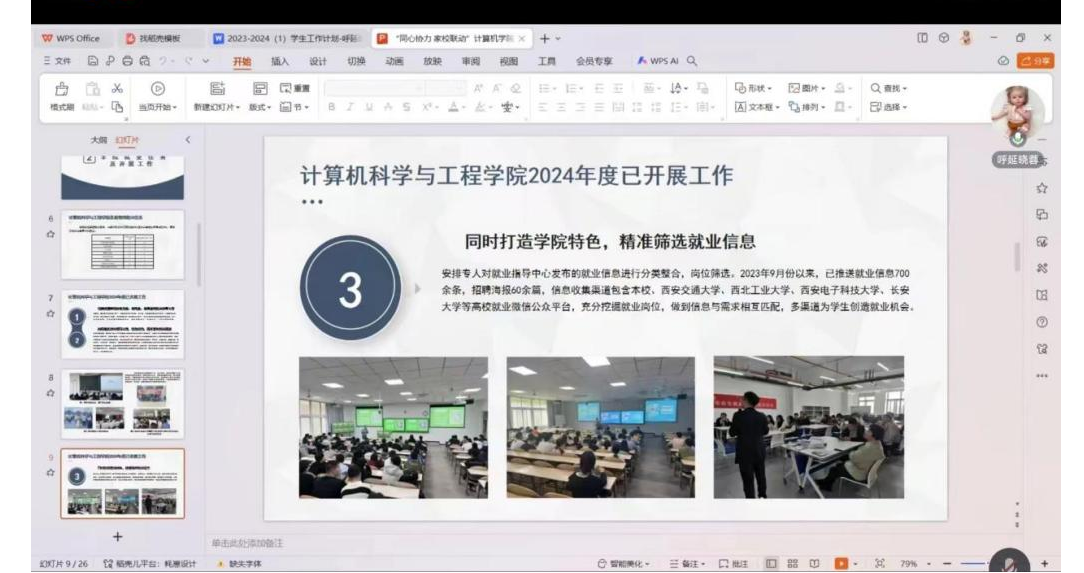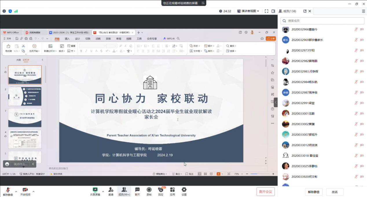参会人员有辅导员呼延晓蓉,计算机20级软件工程专业所有员工,活动开始时,呼延老师对家长们的到来表示欢迎,先是介绍了活动的目的,然后强调了就业对员工未来的重要性,并希望通过家校合作,为毕业生提供更好的职业规划支持。