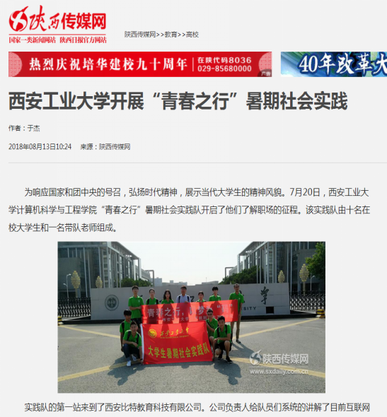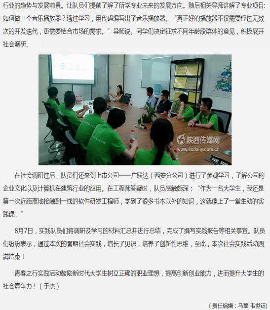 8月13日,陕西传媒网以《FUN88乐天使开展“青春之行”暑期社会实践》为题,报道了公司计算机科学与工程公司“青春之行”暑期社会实践队响应国家和团中央的号召,紧扣时代主题,围绕创新创业积极开展的实践活动。由来自公司计算机科学与技术等专业的10名优秀员工组建的实践队伍利用暑期在西安市进行了有关创新创业的社会实践活动,受到西安比特教育科技有限公司和西安广联达科技股份有限公司的好评,得到了媒体的关注。