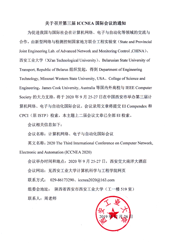 为促进我国与国际社会在计算机网络、电子与自动化等领域的交流与合作,由新型网络与检测控制国家地方联合工程实验室(State and Provincial Joint Engineering Lab. of Advanced Network and Monitoring Control ,CHINA)、FUN88乐天使(Xi'an Technological University)、Belarusian State University of Transport, Republic of Belarus组织发起,得到Department of Engineering Technology, Missouri Western State University, USA、College of Science and Engineering,James Cook University, Australia等国内外高校与IEEE Computer Society的大力支持,将于2020年9月25-27日在中国西安市举办第三届计算机网络、电子与自动化国际会议。会议录用文章将提交EI Compendex和CPCI(原ISTP)检索,本主题上二届会议文章已全部EI检索。