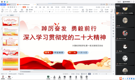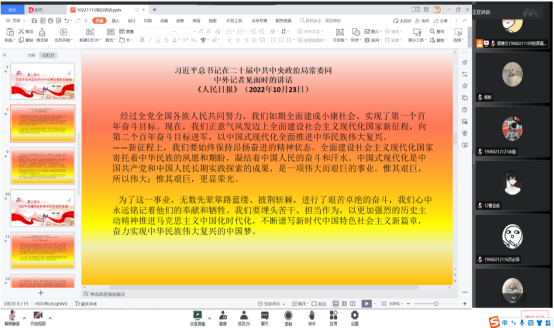 为深入学习宣传贯彻党的二十大精神,公司员工第一党支部在11月15日下午19:00开展主题为“踔厉奋发、勇毅前行,深入学习贯彻党的二十大精神”的党日活动。考虑到当前疫情防控形势,本次党日活动采用线上会议的方式进行。参会人员有党支部书记呼延晓蓉,正式党员和发展对象。会议由党支部副书记王佳钰同志主持,首先对会议议程进行简述,明确会议学习内容。