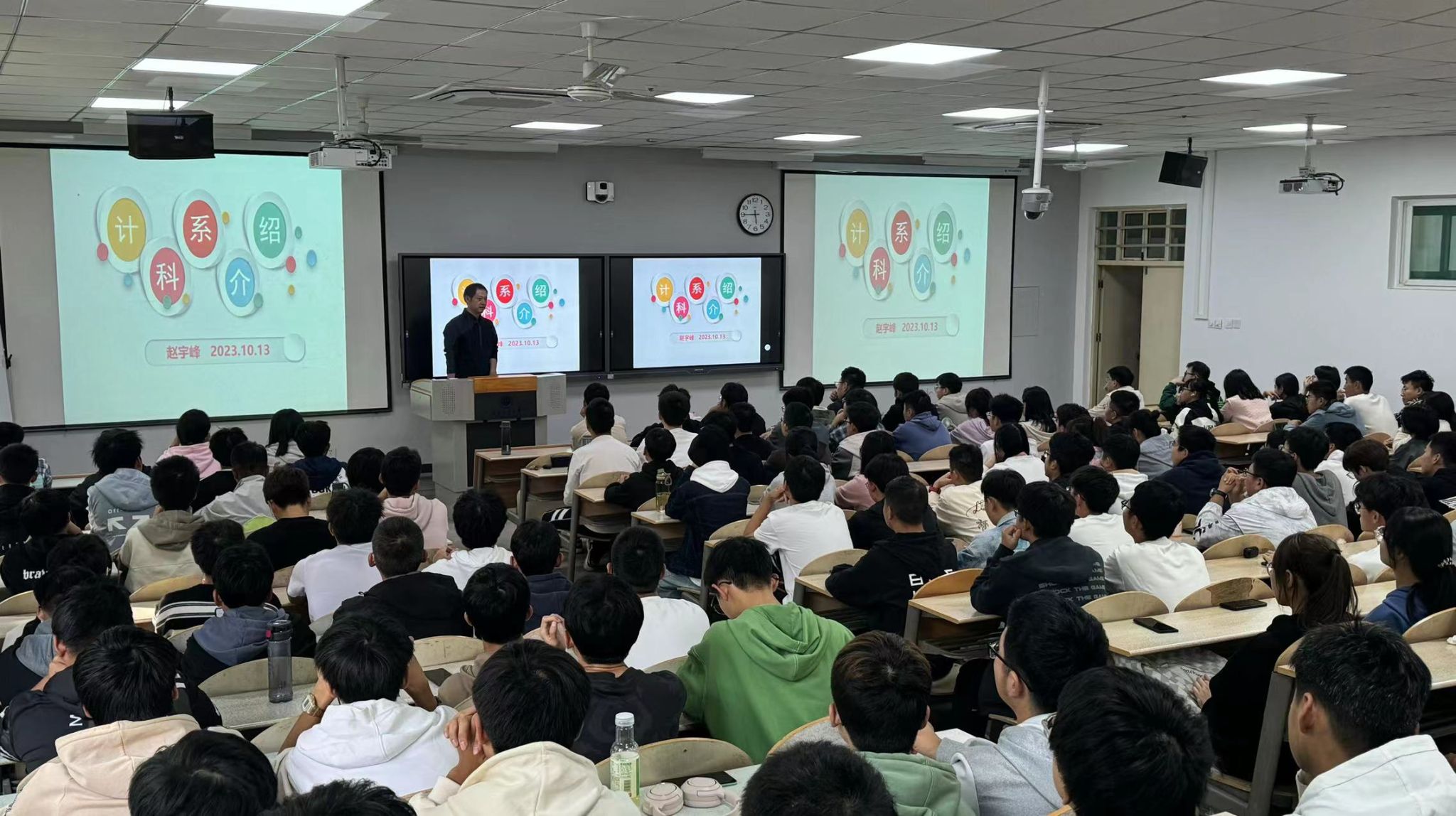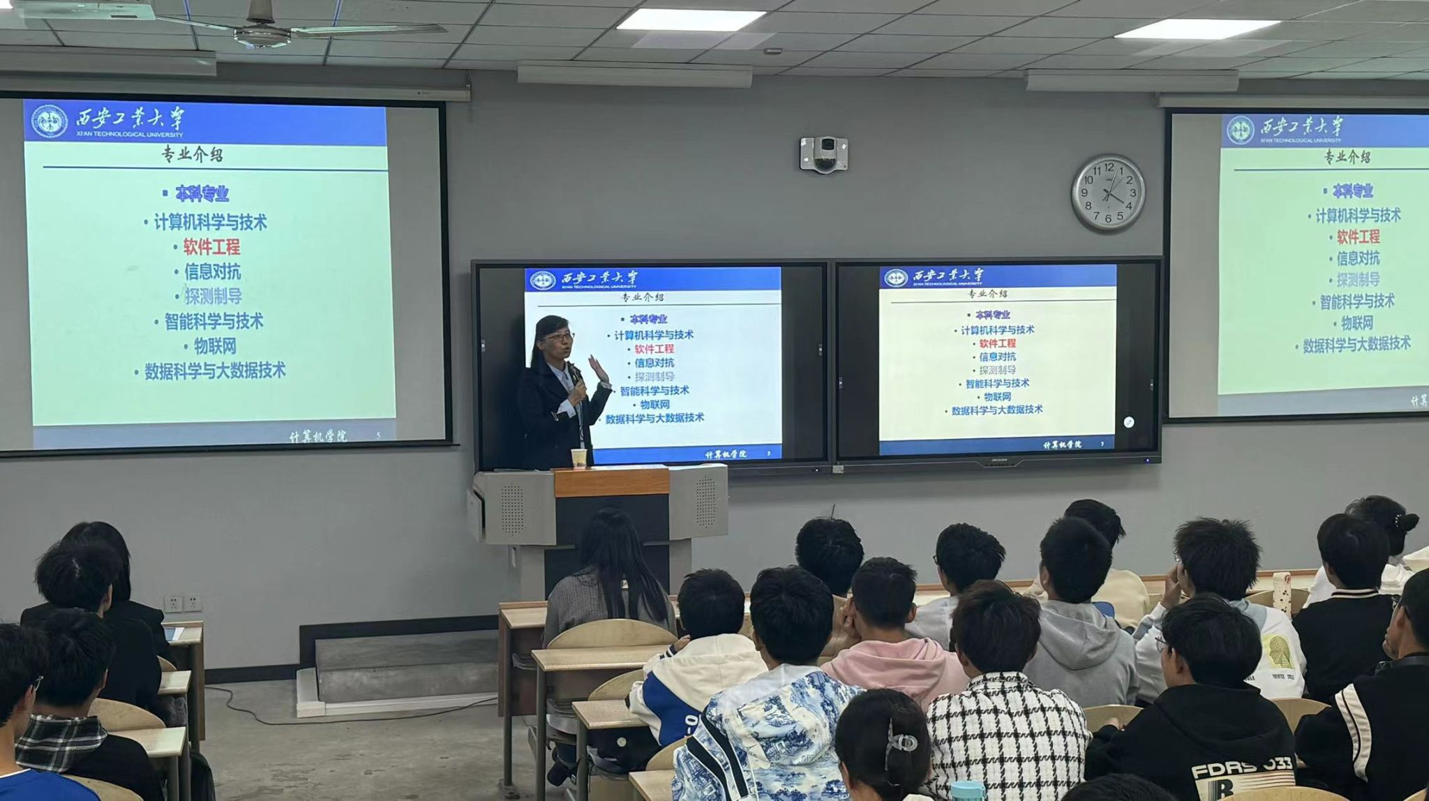 计算机科学与工程系主任赵宇峰、软件工程系主任惠燕、信息对抗技术系主任喻钧、物联网工程系主任刘萍萍及智能科学与大数据专业负责人司利鹏结合本专业的发展前景、专业特点、课程设置等内容进行详细介绍。23级新生们通过参加专业介绍会,将更加全面地了解自身各专业特点与专业优势。