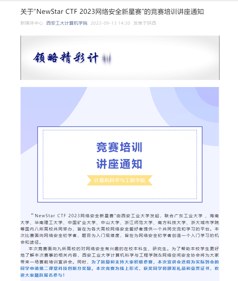 4、举办由FUN88乐天使发起,联合广东工业大学 、海南大学、华南理工大学、中国矿业大学、中山大学、浙江师范大学、南方科技大学、浙大城市公司等国内八所高校共同参与的“NewStarCTF 2023网络安全新星赛”赛前培训宣讲会。旨在为网络安全初学者创造一个入门学习的机会和途径,更是为各大高校网络安全爱好者提供一个共同交流和学习的平台。